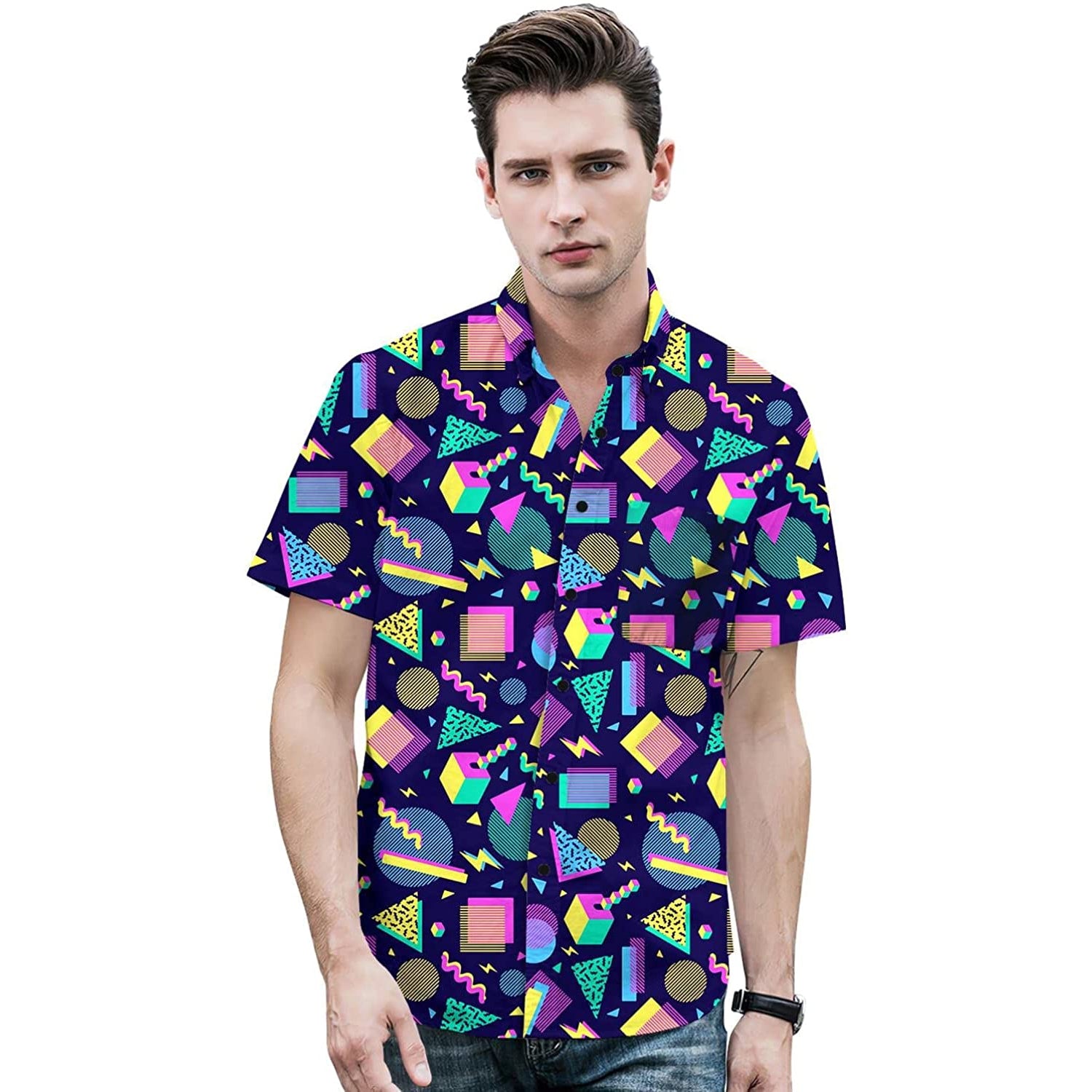 The Funky Retro 80s 90s Style theme designs Hawaiian button-up shirts. It is made with quick-dry material and gives you a comfortable feeling when you wear it on a hot summer day.